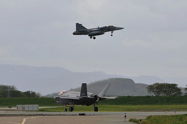 Český gripen nad základnou ?rland v Norsku během cvičení Arctic Challenge 2023. V popředí letoun F-35.