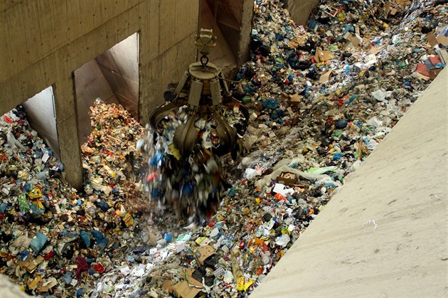 Malešická spalovna - jeden z jeřábů, který nakládá odpad do kotlů a zároveň jej i promíchává, aby směs byla homogenní a tedy s podobnými vlastnostmi.