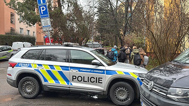 Policisté zasahují v Chotutické ulici v pražských Malešicích, kde je ve 3.patře zabarikádovaný muž, který hrozí zapálením budovy. (5. prosince 2025)