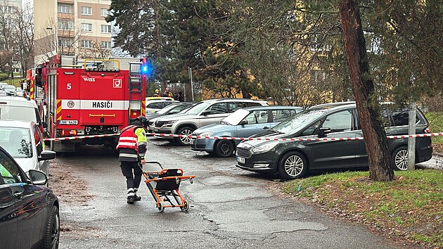 Policisté zasahují v Chotutické ulici v pražských Malešicích, kde je ve 3.patře zabarikádovaný muž, který hrozí zapálením budovy. (5. prosince 2025)