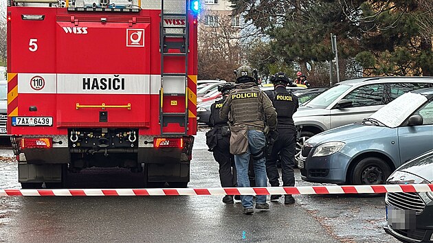 Policisté zasahují v Chotutické ulici v pražských Malešicích, kde je ve 3.patře zabarikádovaný muž, který hrozí zapálením budovy. (5. prosince 2025)
