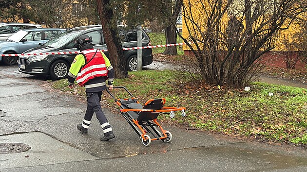Policisté zasahují v Chotutické ulici v pražských Malešicích, kde je ve 3.patře zabarikádovaný muž, který hrozí zapálením budovy. (5. prosince 2025)