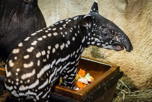 Mládě tapíra čabrakového, který patří k ohroženým druhům, připomíná dalmatina (podrobněji jsme o jeho narození informovali zde). Svůj puntíkovaný kabát však zanedlouho shodí.