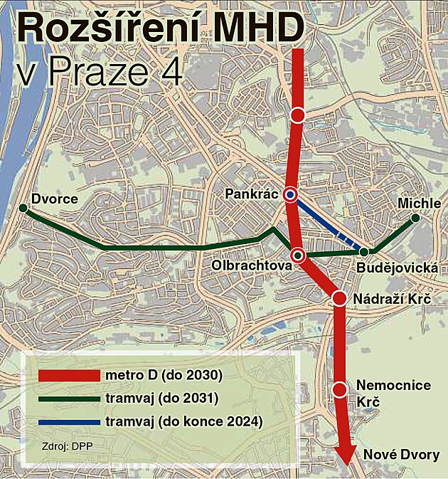Dopravní stavby v Praze 4● Nová linka metra D by v Praze 4 měla ulevit hlavně obyvatelům Krče a Lhotky, a to díky napojení se stanicí Pankrác a dále s novými stanicemi Olbrachtova, Nádraží Krč, Nemocnice Krč a Nové Dvory. ● Nový úsek tramvaje v ulici Na Pankráci, díky kterému se cestující dopraví přímo před OC Arkády Pankrác. Zastávka navíc v příštím roce zastoupí uzavřenou stanici metra C Pankrác. ● Nová tramvajová trať Dvorce – Budějovická – Michle, kde se napojí na stávající tramvajovou trať. Zdroj: DPP |