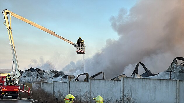 V Předměřicích nad Jizerou na Mladoboleslavsku v noci na čtvrtek začala hořet skladovací hala, na místě zasahuje sto hasičů. (6. března 2025)