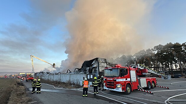 V Předměřicích nad Jizerou na Mladoboleslavsku v noci na čtvrtek začala hořet skladovací hala, na místě zasahuje sto hasičů. (6. března 2025)