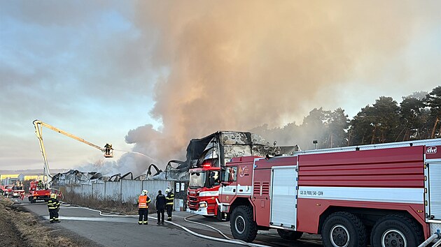 V Předměřicích nad Jizerou na Mladoboleslavsku v noci na čtvrtek začala hořet skladovací hala, na místě zasahuje sto hasičů. (6. března 2025)