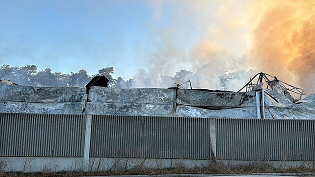 V Předměřicích nad Jizerou na Mladoboleslavsku v noci na čtvrtek začala hořet skladovací hala, na místě zasahuje sto hasičů. (6. března 2025)