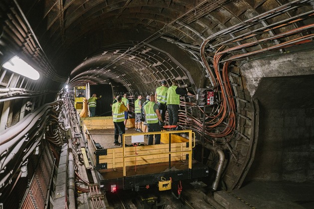 Vagony vezou pracovní četu a spolu s ní obří cívku s vodičem o průměru asi pět centimetrů. Rychlostí pomalé chůze míří souprava směrem ke Křižíkově. Dělníci z cívky neodvíjejí žádný obyčejný drát. Plynule zacvakávají do úchytů na stěně tunelu takzvaný vyzařovací kabel pro šíření signálu. Za směnu jej stihnou instalovat na více než kilometrovém úseku. Kvůli provozu metra mají na práci omezený čas, jen dvě a půl hodiny denně.