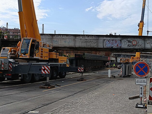 Kvůli instalaci nové ocelové konstrukce železničního mostu je už od sobotní noci uzavřena část Nádražní ulice. (21. července 2025)