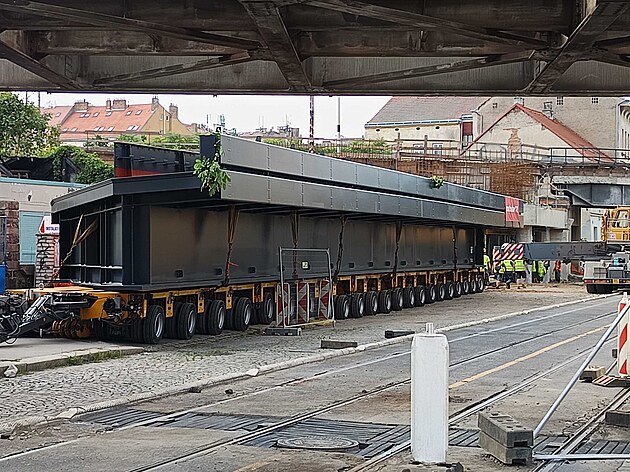 Kvůli instalaci nové ocelové konstrukce železničního mostu je už od sobotní noci uzavřena část Nádražní ulice. (21. července 2025)