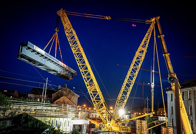 Instalace nové ocelové konstrukce železničního mostu v Nádražní ulici (22. července 2025)