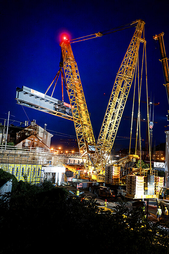 Instalace nové ocelové konstrukce železničního mostu v Nádražní ulici (22. července 2025)