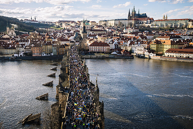 Lidé se přes Karlův most vydali na shromáždění na podporu Ukrajiny na Staroměstské náměstí v den 2. výročí ruské invaze. (24. února 2024)