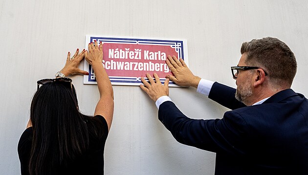 Slavnostní umístění tabule pojmenovávající část vltavského nábřeží u Karlova mostu po Karlu Schwarzenbergovi. (4. září 2025)
