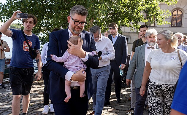Slavnostní umístění tabule pojmenovávající část vltavského nábřeží u Karlova mostu po Karlu Schwarzenbergovi. Na fotografii Jiří Pospíšil s dcerou. (4. září 2025)