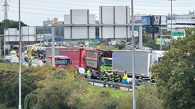 Dopravní nehoda dvou osobních a dvou nákladních aut omezila provoz v pražské ulici 5. května. (10. září 2025)