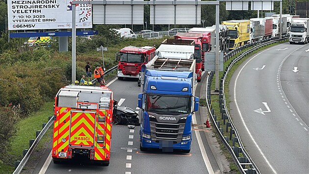 Dopravní nehoda dvou osobních a dvou nákladních aut omezila provoz v pražské ulici 5. května. (10. září 2025)