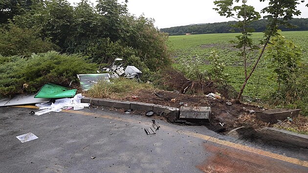 Na dálnici D11 u obce Velenka na Nymbursku projel řidič čerpací stanicí, porazil stojan a skončil v poli. (12. července 2025)