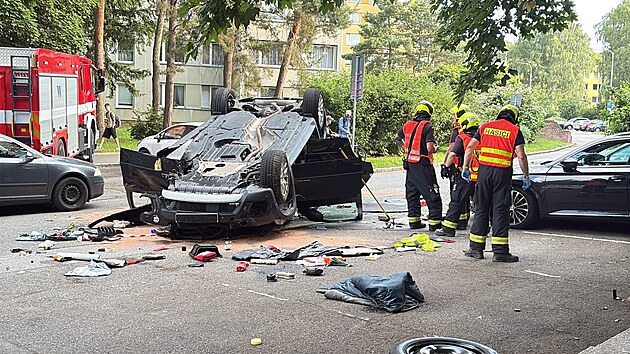 K vyproštění řidiče vyjížděli ve čtvrtek ráno pražští hasiči do Šimůnkovy ulice. (19. června 2025)