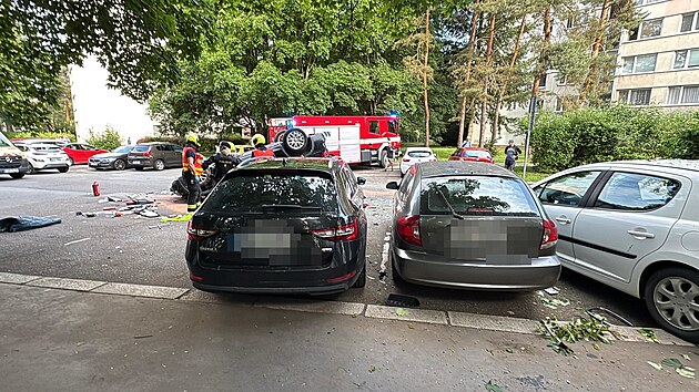 K vyproštění řidiče vyjížděli ve čtvrtek ráno pražští hasiči do Šimůnkovy ulice. (19. června 2025)
