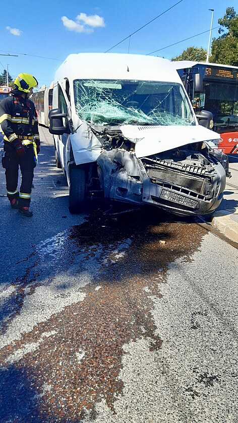 Pražští hasiči zasahují u nehody autobusu s dodávkou. Tři lidé jsou zranění. (18. srpna 2025)