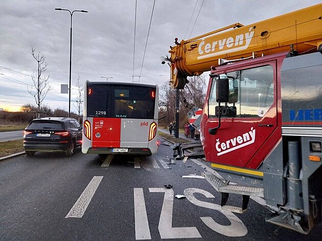 V pondělí krátce ráno se autojeřáb v pražské Liboci srazil s linkovým autobusem. (17. března 2025)