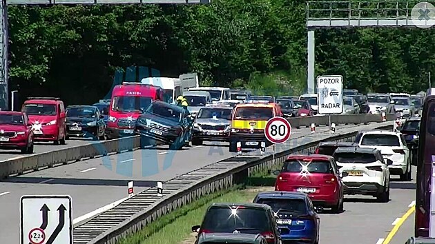 Nehoda na D1 u Mirošovic, auto skončilo na svodidlech. (29. června 2025)