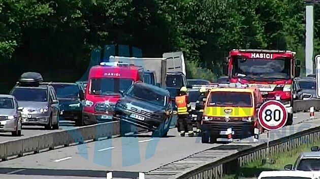 Nehoda na D1 u Mirošovic, auto skončilo na svodidlech. (29. června 2025)