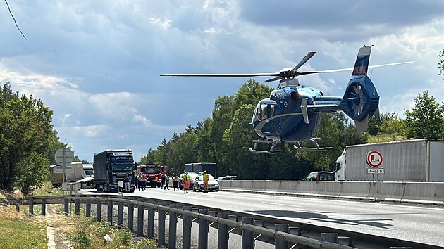 Po nehodě dvou nákladních vozidel na dálnici D5 transportoval vrtulník jednoho zraněného. (10. července 2025)