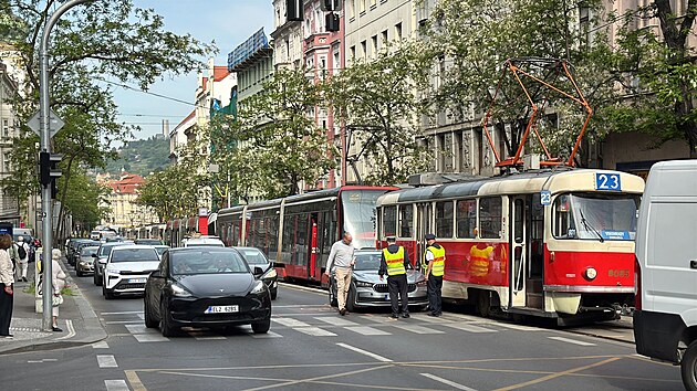 Nehoda dvou osobáků a tramvaje blokuje dopravu v Ječné ulici (14. května 2025)