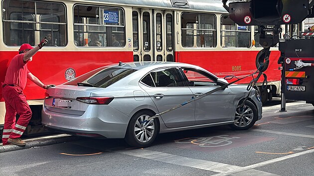 Nehoda dvou osobáků a tramvaje blokuje dopravu v Ječné ulici (14. května 2025)