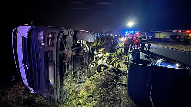 Řidič nákladního vozu sjel v Měšicích do příkopu u silnice. (9. prosince 2025)