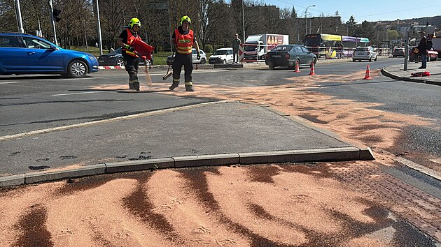 Nehoda autobusu MHD blokuje křižovatku ve Švehlově ulici na Praze 15. (4. dubna 2025)