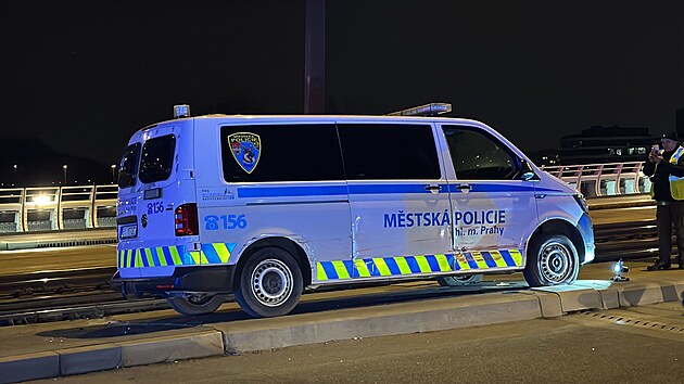 Nehoda dodávky městské policie a osobního auta před Trojským mostem v Praze. (7. února 2025)