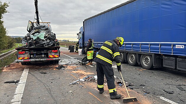 Tragická nehoda uzavřela silnici I/16 u Židněvsi. Řidič osobního vozu po střetu s kamionem na místě zemřel. (15. října 2025)