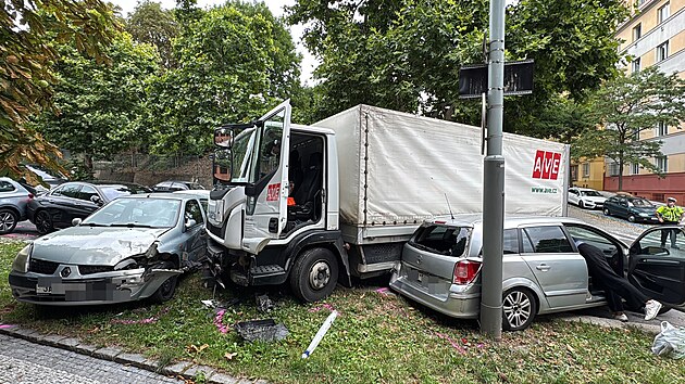 Nehoda jednoho nákladního auta a několika osobních aut v pražské ulici Šrobárova. (1. srpna 2025).