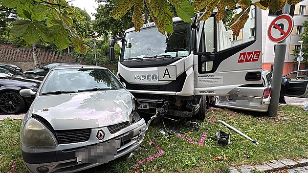 Nehoda několika aut v pražské ulici Šrobárova. (1. srpna 2025).