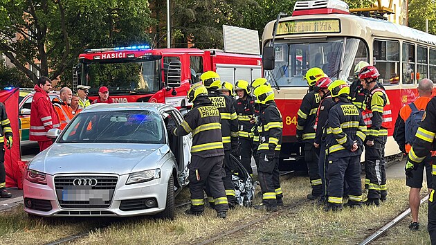 Hasiči vyprošťovali v ulici Na Petřinách řidičku z auta. (15. května 2025)