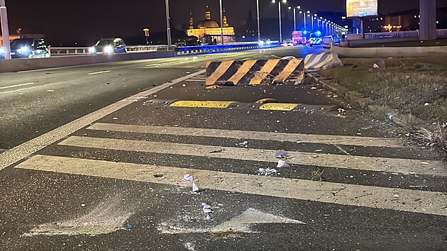 Na Nuselském mostě havarovalo auto a převrátilo se na střechu. (24. března 2025)