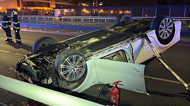Na Nuselském mostě havarovalo auto a převrátilo se na střechu. (24. března 2025)