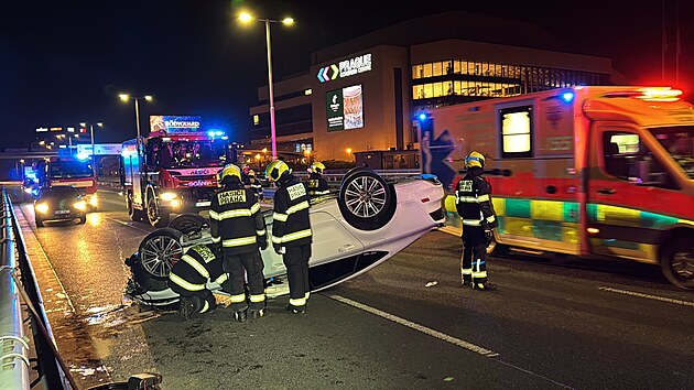Na Nuselském mostě havarovalo auto a převrátilo se na střechu. (24. března 2025)