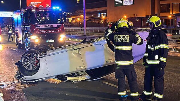 Na Nuselském mostě havarovalo auto a převrátilo se na střechu. (24. března 2025)