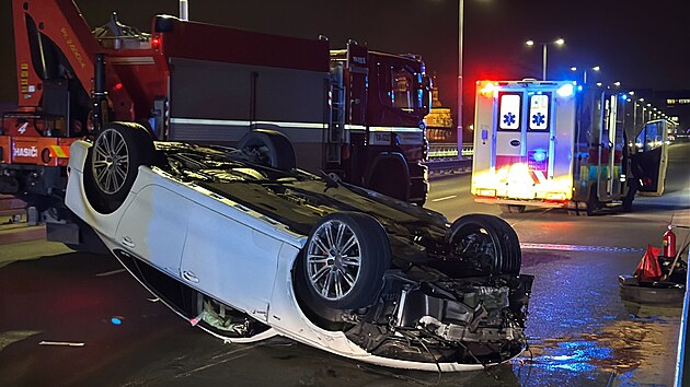 Na Nuselském mostě havarovalo auto a převrátilo se na střechu. (24. března 2025)