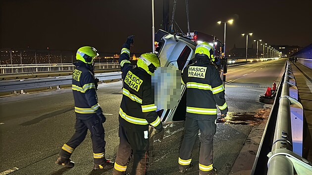 Na Nuselském mostě havarovalo auto a převrátilo se na střechu. (24. března 2025)