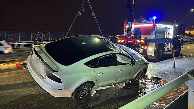 Na Nuselském mostě havarovalo auto a převrátilo se na střechu. (24. března 2025)