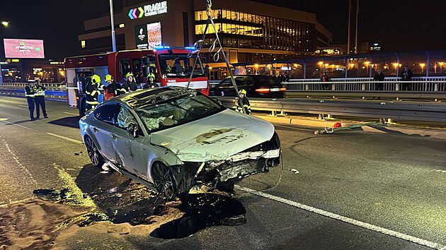 Na Nuselském mostě havarovalo auto a převrátilo se na střechu. (24. března 2025)