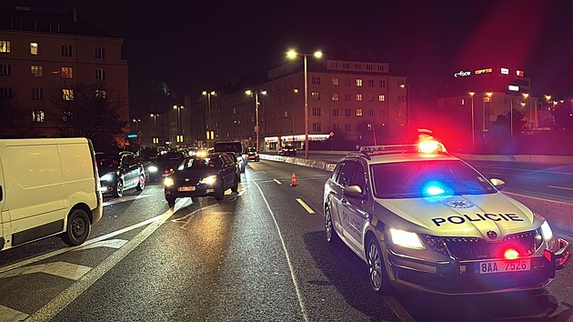 Na Nuselském mostě havarovalo auto a převrátilo se na střechu. (24. března 2025)