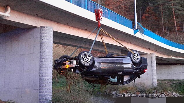 Pak se hasiči pustili do akce. Auto vytáhli zpět na souš vyprošťovacím vozidlem a na silnici jej vrátili pomocí těžké techniky.