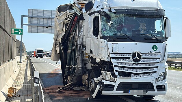 Před Prahou na dálnici D1 došlo k dopravní nehodě dvou kamionů, z jednoho vypadl náklad s pivem. (7. srpna 2025)